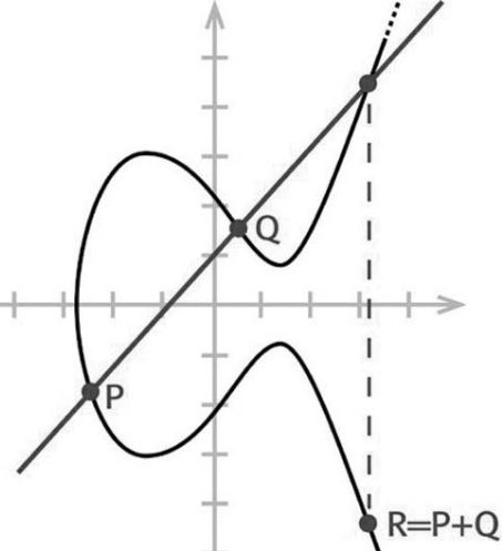 Geometrisch ist diese Addition so zu verstehen: Man bildet die Sekante der auf einer gegebenen elliptischen Kurve gelegenen Punkte P und Q. Der (dritte) Schnittpunkt dieser Sekante mit der elliptischen Kurve R' wird an der x-Achse gespiegelt und man erhält den Punkt R. Rechnerisch lässt sich R einfach ermitteln: Man setzt die Sekante gleich der ell. Kurve und erhält eine Gleichung dritten Grades. Da bereits zwei Nullstellen bekannt sind (P und Q), kann man die dritte Nullstelle leicht bestimmen. Falls P = Q gilt, wird die Sekante durch die Tangente ersetzt.
