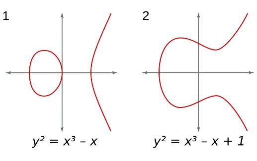 Elliptische Funktionen sind Funktionen der Form: y2 = x3 + a * x + b. Dabei sind a und b reelle Parameter und (um Singularitäten auszuschließen) 4*a3+27*b2 ≠ 0.