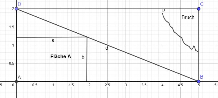 | 8. | Azubi Karl-Theodor hat mal wieder Mist gebaut. Die rechteckige 5 m lange und 2 m breite Glasplatte ist am oberen rechten Rand gebrochen! Um den Schaden möglichst klein zu halten, schneidet er