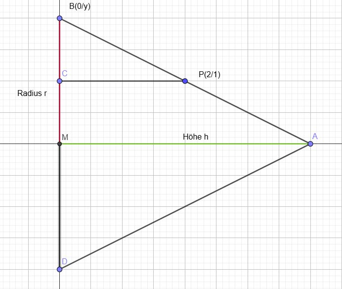 | 9. | Welche Gerade durch P(2/1) begrenzt mit den positiven Koordinatenachsen ein Dreieck, das bei Rotation um die x-Achse einen Kegel mit minimalem Rauminhalt erzeugt? (Anmerkung: Nebenbedingung mit Strahlensatz ab Punkt ((0/y))