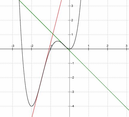 1. Ableitungen: f '(x) = 8⋅x3 + 21⋅x2 + 10⋅x f ''(x) = 24⋅x2 + 42⋅x + 10 f '''(x) = 48⋅x + 42 2. Symmetrie: Die Funktion ist weder punkt- noch achsensymmetrisch, denn f ist eine ganzrationale Funktion mit geraden und ungeraden Exponenten. 3. Schnittpunkte mit den Achsen: Schnittpunkt mit der x-Achse sind Nullstellen: Ansatz: f(x) = 0 Ausklammern: x2 ⋅ (2⋅x2 + 7⋅x + 5) = 0 → x1 = 0 ist doppelte Nullstelle Aus 2⋅x2 + 7⋅x + 5 = 0 → x2 = -2,5 und x3 = -1 Insgesamt: Nullstellen sind N1 (0/0) , N2 (-2,5/0) sowie N3 (-1/0) Da N1 doppelte Nullstelle ist, liegt an der Stelle x = 0 ein Berührpunkt der x-Achse vor. Schnittpunkt mit der y-Achse: f(0) = 0 → (0/0) ist der Schnittpunkt des Graphen von f mit der y-Achse 4. Extremwerte. Notwendige Bedingung: f '(x) = 0 → f '(x) = 8⋅x3 + 21⋅x2 + 10⋅x = x ⋅ (8⋅x2 + 21⋅x + 10) = 0 → xE1 = 0 oder (8⋅x2 + 21⋅x + 10) = 0 aus x2 + x + = 0 → xE2 = -2 oder xE3 = -0,625 Falls die notwendige Bedingung erfüllt ist, genügt als Überprüfung die hinreichende Bedingung f ''(xi) = 24⋅x2 + 42⋅x + 10 ≠ 0: f ''(0) = 24⋅02 + 42⋅0 + 10 = 10 > 0 → E1(0/0) ist rel. Minimum f ''(-2) = 24⋅(-2)2 + 42⋅(-2) + 10 = 190 > 0 → E2(-2/-4) ist rel. Minimum. f ''(-0,625) = 24⋅(-0,625)2 + 42⋅(-0,625) + 10 = -6,875 < 0 → E3(-0,625/0,549) ist rel. Maximum. 5. Wendepunkte: Notwendige Bedingung: f ''(x) = 0 → f ''(x) = 24⋅x2 + 42⋅x + 10 = 0 → x1 ≈ -1,466 oder x2 ≈ -0,284 sind mögliche Wendestellen. Falls die notwendige Bedingung erfüllt ist, genügt als Überprüfung die hinreichende Bedingung f '''(x)≠ 0. f '''(-1,466) = 48⋅(-1,466) + 42 < 0 → W1(-1,466/-2,07) ist Wendepunkt f '''(-0,284) = 48⋅(-0,284) + 42 > 0 → W2(-0,284/0,256) ist Wendepunkt 6. Verhalten für sehr kleine und sehr große x: $$\lim_{x \to -\infty} f(x)~=~+\infty ~~~~~~~~~\lim_{x \to +\infty} f(x)~=~+\infty$$ Wendetangenten bestimmen mit dem Ansatz t(x) = m ⋅ x + b: für W1 (-1,466/-2,07): Die Steigung m entspricht der Ableitung an der Wendestelle: m = f '(x1) = f '(-1,466) = 8⋅(-1,466)3 + 21⋅(-1,466)2 + 10⋅(-1,466) ≈ 5,27 Um b zu berechnen, setzt man den Wendepunkt in die Tangentengleichung ein: b = f(-1,466) - f '(-1,466) ⋅ (-1,466) ≈ -2,07 - 5,27 ⋅ (-1,466) ≈ 5,66 Insgesamt t1(x) = 5,27 ⋅ x + 5,66 Entsprechend für t2: m2 = f '(-0,284) ≈ -1,33 sowie b2 ≈ 0,256 - (-1,33) ⋅ (-0,284) ≈ -0,12 Insgesamt t2(x) = -1,33 ⋅ x - 0,12 Tangentengleichungen gleichsetzen: t1(x) = t2(x) → 5,27 ⋅ x + 5,66 = -1,33 ⋅ x - 0,12 Daraus folgt: xs ≈ -0,88 xs in eine Tangentengleichung einsetzen. t1(-0,88) = 5,27 ⋅ (-0,88) + 5,66 ≈ 1,02 Der Schnittpunkt der Wendetangente ist etwa (-0,88/1,02). |