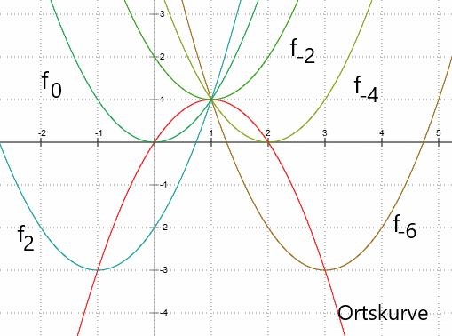 | 5. | Durch f1(x) = x2 + k⋅x – k ; k ∈ R ist eine Funktionenschar gegeben. a) Zeichnen Sie die Graphen von f-6 , f-4 , f-2, f0, f2 in ein Koordinatensystem. b) Berechnen Sie die Schnittpunkte mit der x-Achse. Für welche Werte von k sind 2 Schnittpunkte vorhanden? c) Ermitteln Sie das Minimum. d) Zeigen Sie, dass alle Graphen durch den Punkt (1/1) gehen. e) Für welchen Wert von k ist das Minimum von fk am größten? f) Geben Sie die Ortskurve der Extrema an.