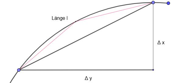 Länge der Sekante im Intervall [a,b]: \(l=(\sqrt{(\Delta x)^2 + (\Delta y)^2} = \sqrt{1+\left(\frac{\Delta y}{\Delta x}\right)^2 }\cdot \Delta x\)