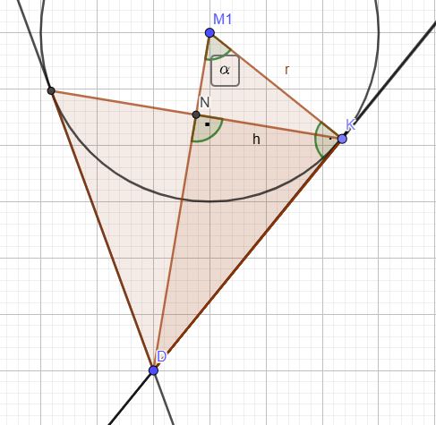 zu a) \(\vec{AB}=\begin{pmatrix} 1 \\ 8\\ -5 \end{pmatrix}~~~~~~~~\vec{AC}=\begin{pmatrix} -2 \\ 8 \\ -2 \end{pmatrix}~~~~~~~~\vec{BC}=\begin{pmatrix} -3 \\ 0 \\ 3 \end{pmatrix}\) \(\vec{AC}\cdot\vec{BC}=\begin{pmatrix} -2 \\ 8 \\ -2 \end{pmatrix}\cdot\begin{pmatrix} -3 \\ 0 \\ 3 \end{pmatrix}=6+0-6=0~\rightarrow~\vec{AC}\perp\vec{BC}\) zu b) Ebene E in Punktrichtungsform: E: \( \vec{r}~=~ \vec{a}~+~\lambda\cdot(\vec{b}-\vec{a})~+~\mu\cdot(\vec{c}-\vec{a})~~\) E: \(\vec{r}~=~\begin{pmatrix} 0 \\ -4 \\ 3 \end{pmatrix} ~+~\lambda \cdot \begin{pmatrix} 1 \\ 8\\ -5 \end{pmatrix}~+~\mu \cdot \begin{pmatrix} -2 \\ 8 \\ -2 \end{pmatrix}\) Ebene E in Normalenform: \(\vec{n}\cdot (\vec{r}-\vec{a})=0 \) mit Normalenvektor \(\vec{n'}=\begin{pmatrix} 1 \\ 8 \\ -5 \end{pmatrix} \times \begin{pmatrix} -2 \\ 8 \\ -2 \end{pmatrix}= \begin{pmatrix} 24 \\ 12 \\ 24 \end{pmatrix} \)\(~\rightarrow~\vec{n}=\begin{pmatrix} 2 \\ 1 \\ 2 \end{pmatrix}\) Und daraus E: \(\begin{pmatrix} 2 \\ 1 \\ 2 \end{pmatrix}\cdot \left(\vec{r}- \begin{pmatrix} 0 \\ -4 \\ 3 \end{pmatrix}\right)=0\) oder in Koordinatenform E: 2x1 + x1 + 2x3 - 2 = 0 zu c) Mit der 2-Punkte -Form folgt: g: \( \vec{r}~=~ \vec{d}~+~\lambda\cdot(\vec{f}-\vec{d})~\)\(~\rightarrow~~\vec{r}~=~\begin{pmatrix} 2 \\ 4 \\ 2 \end{pmatrix} ~+~\lambda \cdot \begin{pmatrix} 1 \\ 2 \\ 0 \end{pmatrix} \) Determinante der Spannvektoren und des Richtungsvektor bestimmen: det(\(\vec{AB},\vec{AC},\vec{DF}\)) = 48 ≠ 0 → g und E schneiden sich. zu d) Zum Ortsvektor des Punktes A wird die dreifache Länge des Normaleneinheitsvektors von E addiert oder subtrahiert. \(\vec{m_1}=\vec{a}+3\cdot\frac{1}{3}\cdot\vec{n^0}=\begin{pmatrix} 0 \\ -4 \\ 3 \end{pmatrix}+3\cdot\frac{1}{3}\cdot\begin{pmatrix} 2 \\ 1 \\ 2 \end{pmatrix}=\begin{pmatrix} 2 \\ -3 \\ 5 \end{pmatrix}\)\(~\rightarrow~M_1(2/-3/5)\) \(\vec{m_2}=\vec{a}-3\cdot\frac{1}{3}\cdot\vec{n^0}=\begin{pmatrix} 0 \\ -4 \\ 3 \end{pmatrix}-3\cdot\frac{1}{3}\cdot\begin{pmatrix} 2 \\ 1 \\ 2 \end{pmatrix}=\begin{pmatrix} -2 \\ -5 \\ 1 \end{pmatrix}\)\(~\rightarrow~M_1(-2/-5/1)\) zu e) ![]() K ist ein Berührpunkt des Kegels an die Kugel. Die Höhe h des Dreiecks DKM1 entspricht dem Radius der Grundfläche des Tangentialkegels. Die Höhe des Tangentialkegels entspricht dem Abstand der Punkte N und D. Das Dreieck DKM1 ist rechtwinklig aufgrund der Tangentialkonstruktion. Der Tangentialkegel berührt die Kugel in einem Kreis. Dieser Kreis ist der Schnittkreis der Kugel mit der Ebene T: \((\vec{x}-\vec{m_1})\cdot(\vec{d}-\vec{m_1})=r^2\) Es gilt: T: \(\left(\vec{x} - \begin{pmatrix}2\\-3\\5 \end{pmatrix} \right)\cdot\left(\begin{pmatrix}2\\4\\2 \end{pmatrix} - \begin{pmatrix}2\\-3\\5 \end{pmatrix} \right)=9\) Zusammenfassen: T: \(\left(\vec{x} - \begin{pmatrix}2\\-3\\5 \end{pmatrix} \right)\cdot\begin{pmatrix}0\\7\\-3 \end{pmatrix}=9\) oder T: \(\begin{pmatrix}0\\7\\-3 \end{pmatrix}\cdot\vec{x}+27=0\) N ist der Schnittpunkt der Ebene T mit der zu T orthogonalen Geraden h durch D (bzw. M1). h: \( \vec{r}~=~ \begin{pmatrix} 2 \\ 4 \\ 2 \end{pmatrix} ~+~\lambda \cdot \begin{pmatrix} 0 \\ 7 \\ -3 \end{pmatrix} \) h in T einsetzen: \(\begin{pmatrix} 0 \\ 7 \\ -3 \end{pmatrix}\cdot \left(\begin{pmatrix} 2 \\ 4 \\ 2 \end{pmatrix} + \lambda \begin{pmatrix} 0 \\ 7 \\ -3 \end{pmatrix}\right)+27=0\) \(~\rightarrow~22+58\lambda+27=0\) \(~\rightarrow ~\lambda=-\frac{49}{58}\) λ in h einsetzen: \(\vec{f}= \begin{pmatrix} 2 \\ 4 \\ 2 \end{pmatrix} -\frac{49}{58}\cdot \begin{pmatrix} 0 \\ 7 \\ -3 \end{pmatrix}\) \(~\rightarrow~N(2/-\frac{111}{58}/\frac{263}{58})\) Höhe des Tangentialkegels hK = |\(\vec{DN}\)| = \(\left|\frac{1}{58}\cdot \begin{pmatrix} 0 \\ -343 \\ 147 \end{pmatrix}\right|\approx 6,43\) Es gilt: |\(\vec{DM_1}\)| = \(\left|\begin{pmatrix} 0 \\ -7 \\ 3 \end{pmatrix}\right|=\sqrt{58}\approx 7,62\) Daraus folgt: |\(\vec{NM_1}\)| ≈ 7,62 - 6,43 = 1,19. Mit dem Höhensatz des Euklid lässt sich nun leicht die Höhe h berechnen: h = \(\sqrt{\vec{NM_1}\cdot\vec{DN}} \approx 2,77\). Daraus erhält man für das Volumen des Tangentialkegels: V = \(\frac{1}{3}\)⋅2,772⋅6,43 ≈ 16,4 VE. |