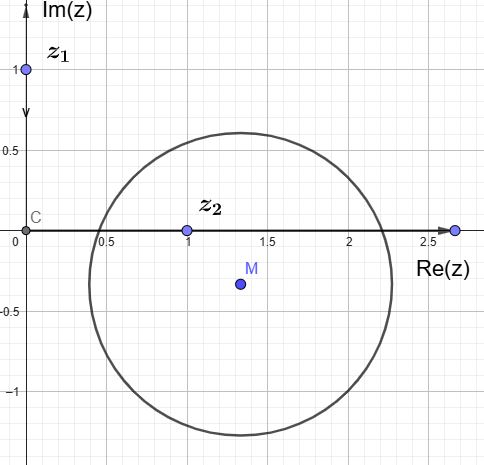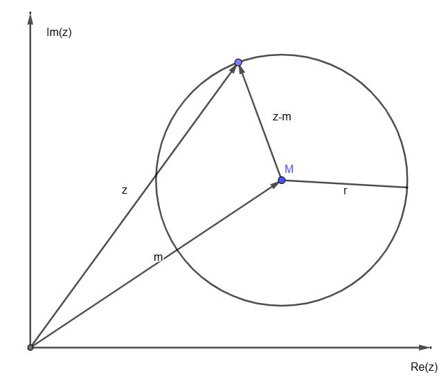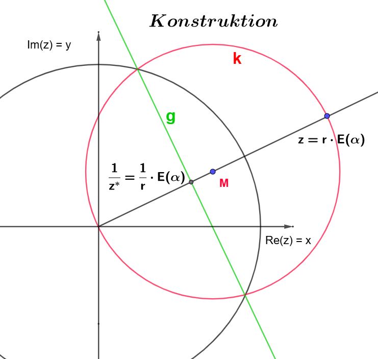 Kreis Kr(m) = {z| \(\boldsymbol{zz^{*}-m^{*}z-mz^{*}+\gamma~=~0~~mit~~\gamma\in\mathbb{R}~~und~~mm^{*}-\gamma > 0}\)}