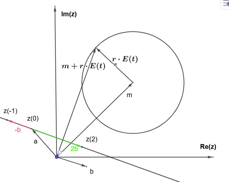 Kreislinie mit Mittelpunkt m∈ \(\mathbb{C}\) und Radius r∈\(\mathbb{R}^+\) in Parameterform: {z(t)| z(t) = m + r⋅E(t) und 0≤t≤2π}.1.5. Aufgaben